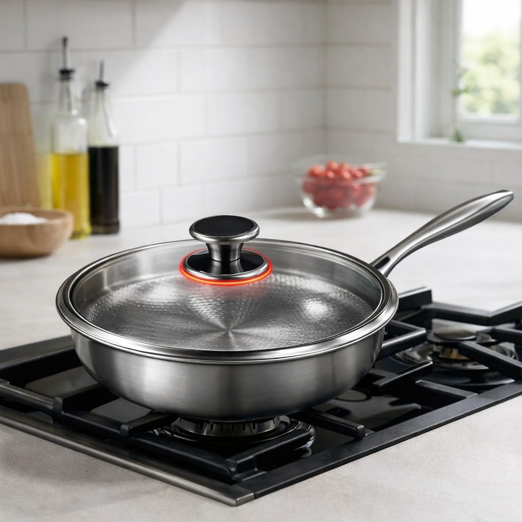 Upgrade your everyday cooking experience with the QhoulCore Titanium Frying Pan, thoughtfully engineered for durability, versatility, and ease of use. This 26cm frying pan features a titanium-enhanced cooking surface combined with SS430 and SS304 stainless steel, offering reliable heat distribution and long-lasting structural strength. The honeycomb textured interior helps reduce sticking while supporting even oil flow, making it suitable for a wide range of cooking styles from quick breakfasts to full meals. Designed for convenience, the pan includes a detachable stainless steel handle for compact storage and easy handling, along with a tempered glass lid that allows you to monitor food without interrupting cooking. The flat base ensures stable contact with various cooktops, making it a practical addition to modern kitchens. With a balanced weight, clean brushed finish, and functional design, the QhoulCore Titanium Frying Pan is built for everyday use, combining performance and simplicity in one essential cookware piece.